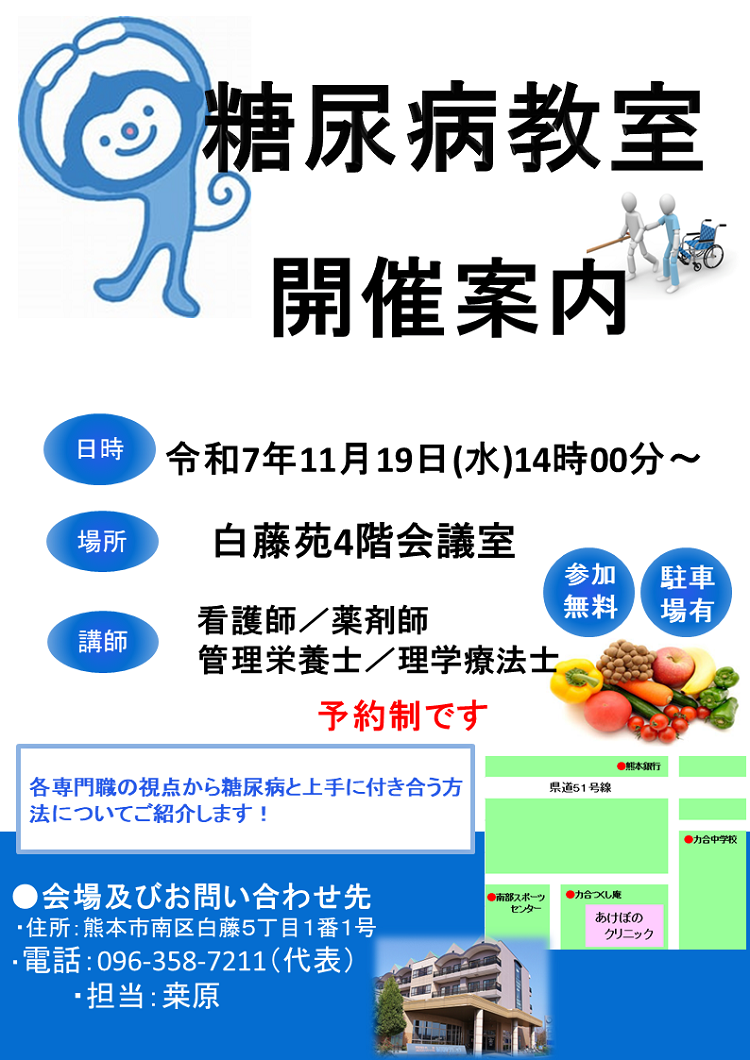 11月19日(水)、14時より「糖尿病教室」を開催します 2025.10.22 あけぼのクリニック 11/19(水)に本年度2回目の糖尿病教室を開催します。 どなたさまでもご参加いただけますので、ご参加下さい。予約制としていますのでお電話をお願いします。
