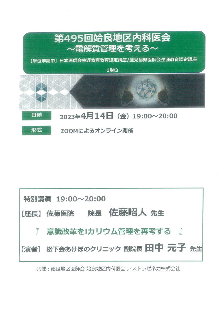 2023.05.01 「姶良地区内科医会」で講演を行いました あけぼのクリニック 2023年4月14日(金)、Zoomによるオンラインで開催されました 第495回姶良地区内科医会~電解質管理を考える~で あけぼのクリニックの田中副院長が「意識改革を!カリウム管理を再考する」について講演を行いました。 ページ送り 一覧へ戻る 前の記事へ 次の記事へ