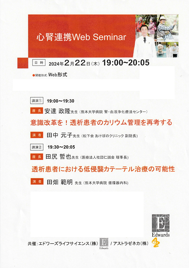2024.04.15 「心腎連携Web Seminar」で講演を行いました あけぼのクリニック 2024年2月22日(木)にWeb形式で開催されました 「心腎連携Web Seminar」であけぼのクリニックの田中副院長が 演題「意識改革を!透析患者のカリウム管理を再考する」について講演を行いました。 ページ送り 一覧へ戻る 前の記事へ 次の記事へ