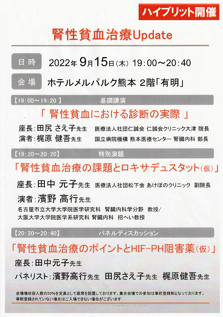 2022.09.20 「腎性貧血治療Update」で座長を務めました あけぼのクリニック 2022年9月15日(木)、ホテルメルパルク熊本で開催されましたハイブリッド講演会で あけぼのクリニックの田中副院長が 特別演題「腎性貧血治療の課題とロキサデュスタット」、 パネルディスカッション「腎性貧血治療のポイントとHIF-PH阻害薬」にてそれぞれ座長を務めました。 ページ送り 一覧へ戻る 前の記事へ 次の記事へ