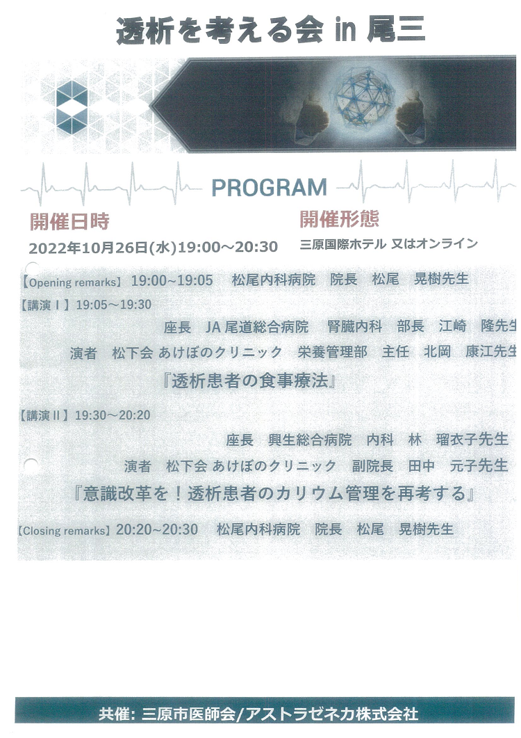 2023.04.03 「透析を考える会 in 尾三」で講演しました あけぼのクリニック 2022年10月26日(木)ハイブリッドで開催されました「透析を考える会 in 尾三」で あけぼのクリニックの田中副院長が 演題「意識改革を!透析患者のカリウム管理を再考する」について あけぼのクリニックの北岡主任管理栄養士が 演題「透析患者の食事療法」についてそれぞれ講演を行いました。 ページ送り 一覧へ戻る 前の記事へ 次の記事へ