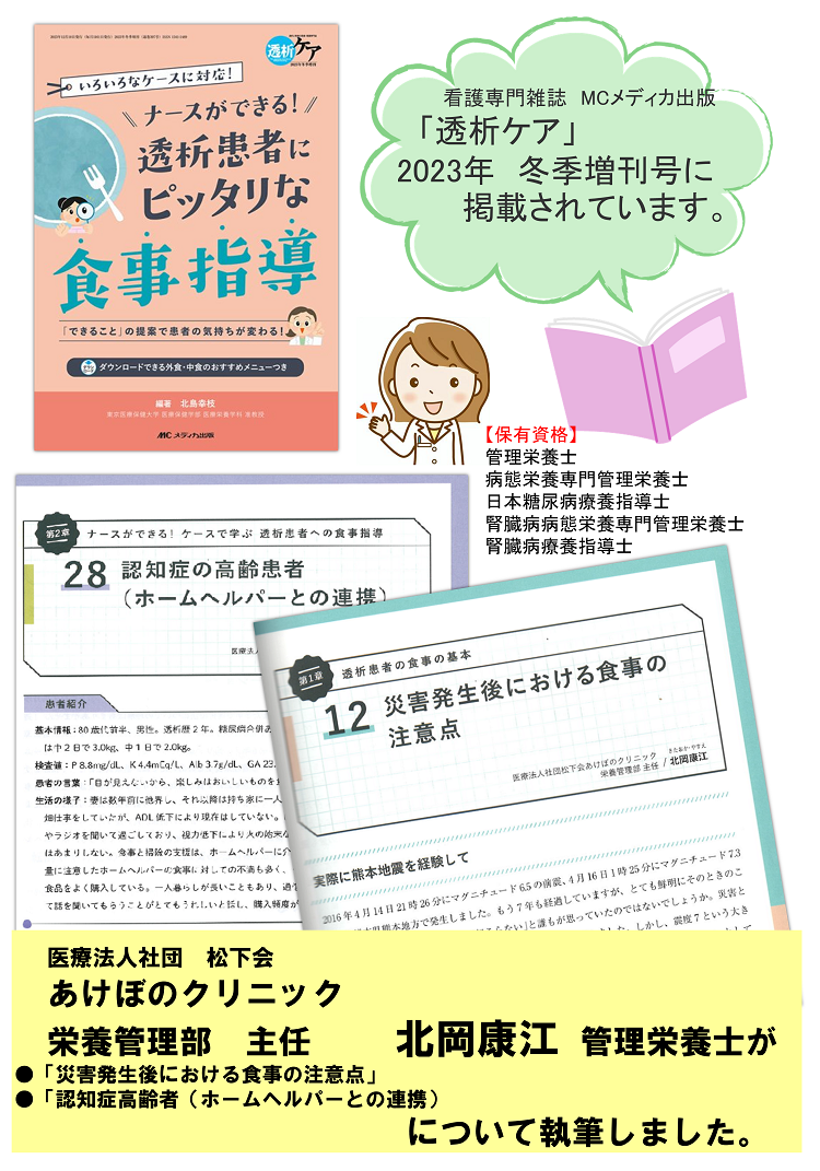 2024.01.29 「透析ケア」2023年冬季増刊号に執筆しました あけぼのクリニック 「透析ケア」2023年冬季増刊号 「いろいろなケースに対応! ナースができる! 透析患者にピッタリな食事指導」で、 あけぼのクリニックの北岡主任管理栄養士が下記の2項目について執筆、掲載されました。 ●災害発生後における食事の注意点 ●認知症の高齢透析患者(ホームヘルパーとの連携) さまざまな透析患者のケースを通して、食事指導の実際を解説しています。 ページ送り 一覧へ戻る 前の記事へ 次の記事へ