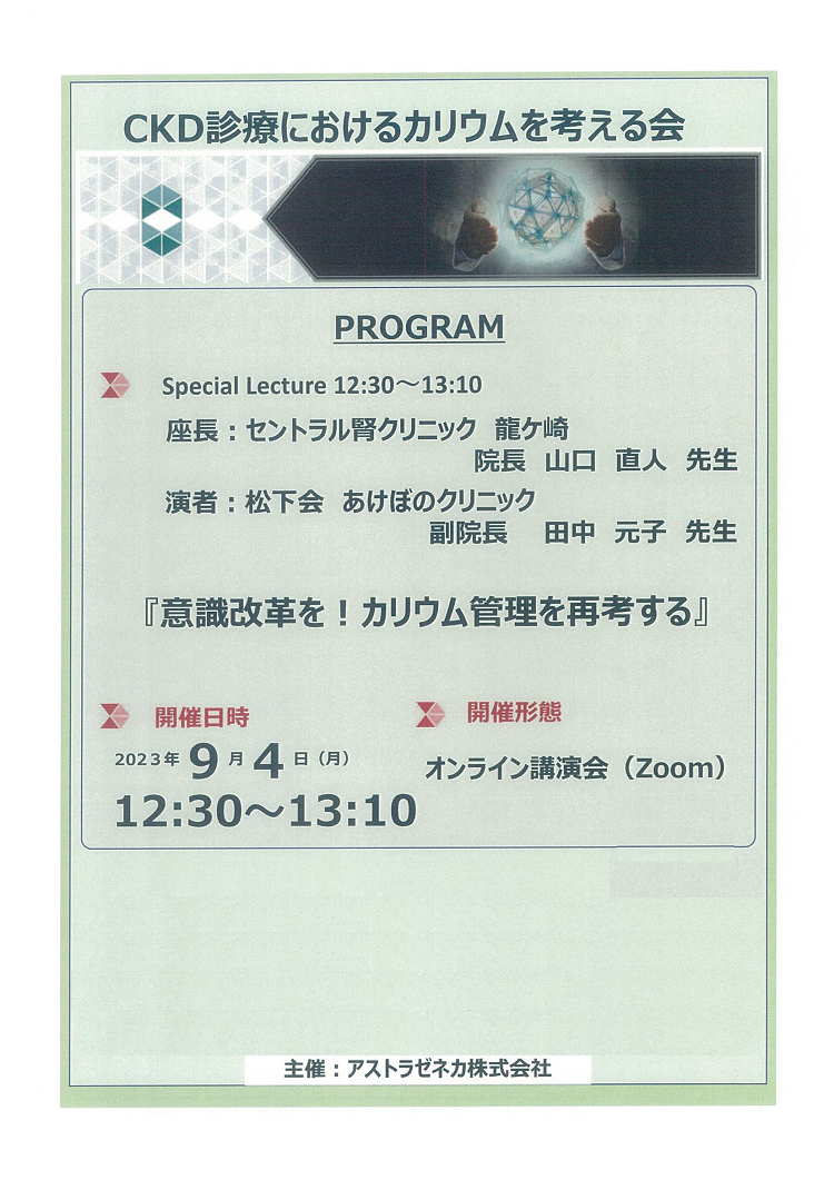 2023.10.02 「CKD診療におけるカリウムを考える会」で講演を行いました あけぼのクリニック 2023年9月4日(月)にオンラインで開催されました「CKD診療におけるカリウムを考える会」で あけぼのクリニックの田中副院長が演題「意識改革を!カリウム管理を再考する」について 講演を行いました。 ページ送り 一覧へ戻る 前の記事へ 次の記事へ
