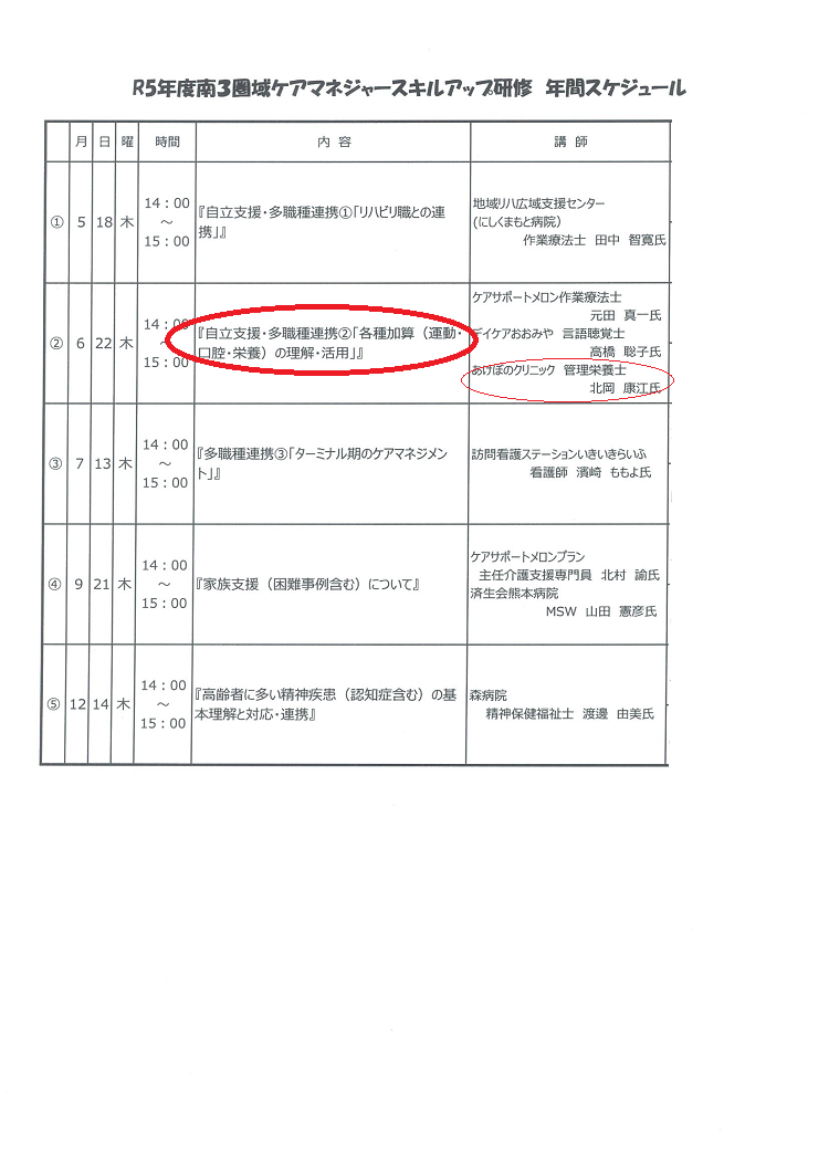 2023.07.03 南3圏域ケアマネージャースキルアップ研修で講師を務めました あけぼのクリニック 6月22日(木)、ささえりあ主催の令和5年度南3圏域ケアマネージャースキルアップ研修 「自立支援・多職種連携②各種加算(運動・口腔・栄養)の理解・活用」で、 あけぼのクリニックの北岡主任管理栄養士が栄養部門の講師を務めました。 ページ送り 一覧へ戻る 前の記事へ 次の記事へ