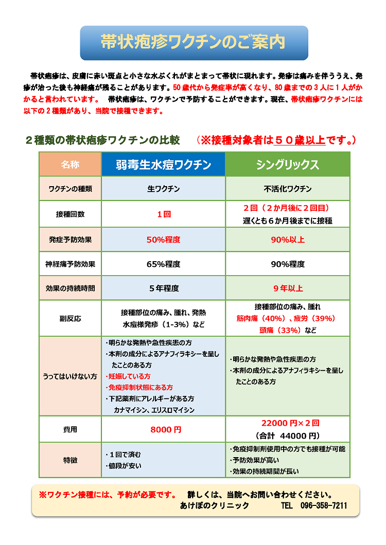 2022.08.30 帯状疱疹ワクチンの任意接種を2022年9月1日より始めます あけぼのクリニック 50歳を過ぎたら、帯状疱疹の予防接種ができます。 帯状疱疹ワクチンには、2種類あり、当院で接種可能です。 詳しくは、当院へお問い合わせください。TEL:096-358-7211 ページ送り 一覧へ戻る 前の記事へ 次の記事へ
