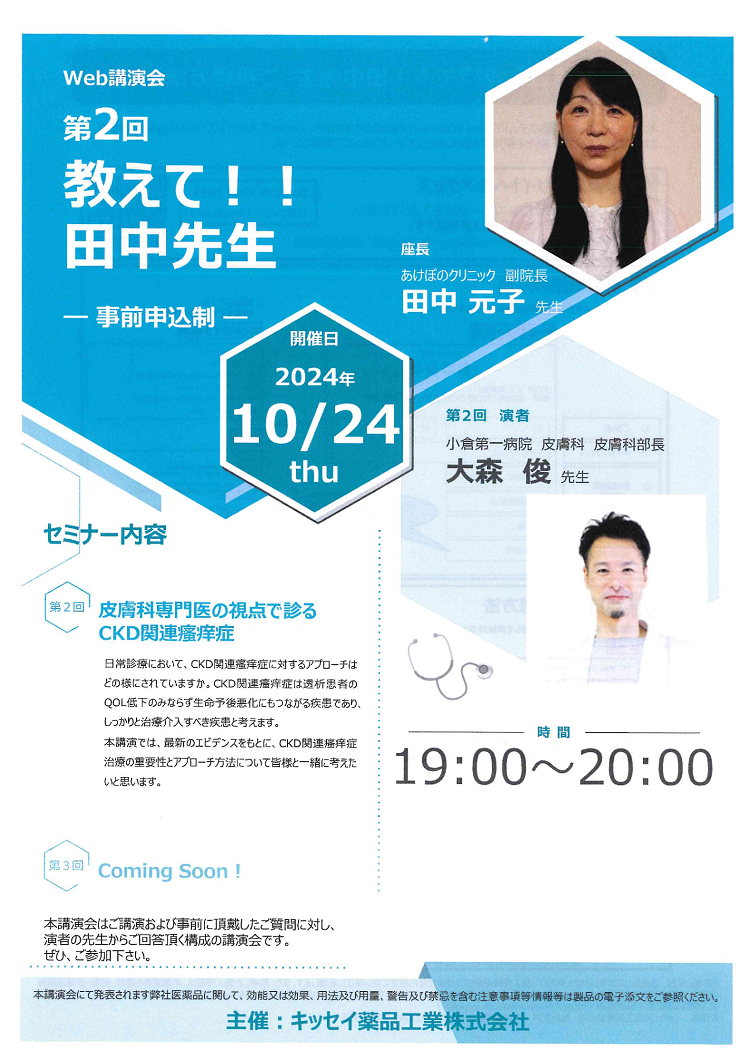 2024.12.16 「第2回 教えて!!田中先生」で座長を務めました あけぼのクリニック 2024年10月24日(木)にWebで開催されました 「第2回 教えて!!田中先生」であけぼのクリニックの田中副院長が 「皮膚科専門医の視点で診るCKD関連瘙痒症」について座長を務めました。 ページ送り 一覧へ戻る 前の記事へ 次の記事へ