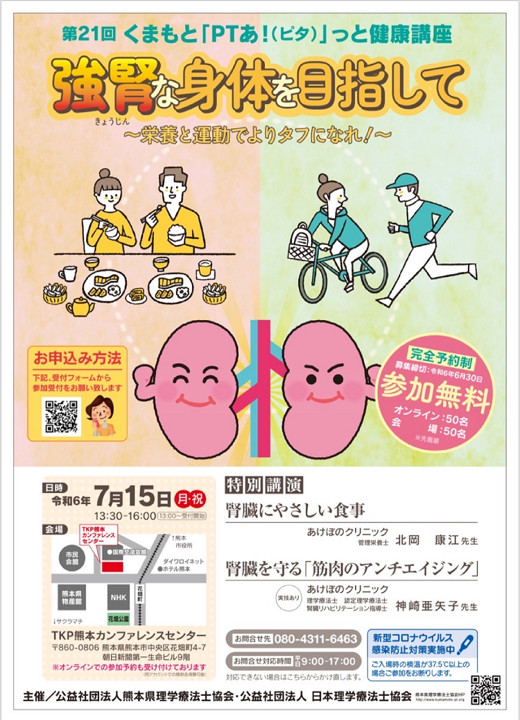 2024.07.29 第21回くまもと「PTあ!(ピタ)」っと健康講座で講師を務めました あけぼのクリニック 2024年7月15日(月)にTKP熊本カンファレンスセンターでオンラインと同時開催されました 第21回くまもと「PTあ!(ピタ)」っと健康講座 『強腎な身体を目指して ~栄養と運動でよりタフになれ!~ 』で あけぼのクリニックの北岡主任管理栄養士が【特別講演】「腎臓にやさしい食事」について あけぼのクリニックのリハビリ部 神崎理学療法士が腎臓を守る「筋肉のアンチエイジング」について それぞれ講演を行いました。 ページ送り 一覧へ戻る 前の記事へ 次の記事へ